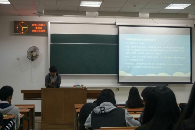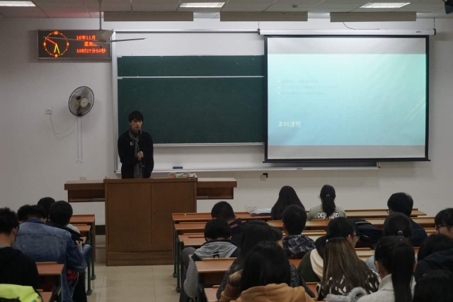 林攒同学从本科课程、选修课推荐课程、我院保研政策与考研这几个方面展开演讲,帮助新生们更好的理解了自己目前所学课程和将要学习的课程。最后林攒同学以一句:“趁着年轻,多经历一些总是好的”结束了此次演讲。