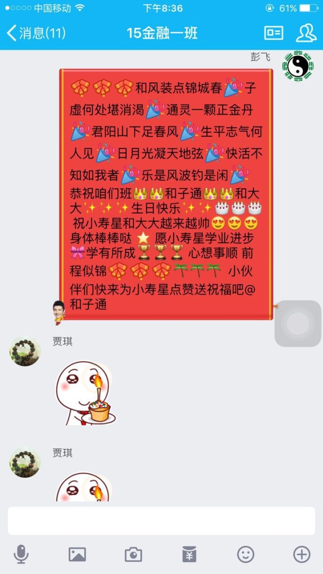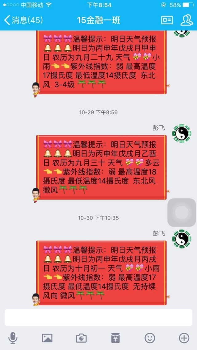 每天不忘在班级里发天气预报、每当同学生日都会在班群中送上真诚的生日祝福……这就是金沙9001cc 以诚为本2015级金融学1班的生活委员彭飞同学已经坚持了一年的习惯。他说:“在其位,谋其政,任其职,尽其责。不忘初心,方得始终。我还会一直坚持下去的。”