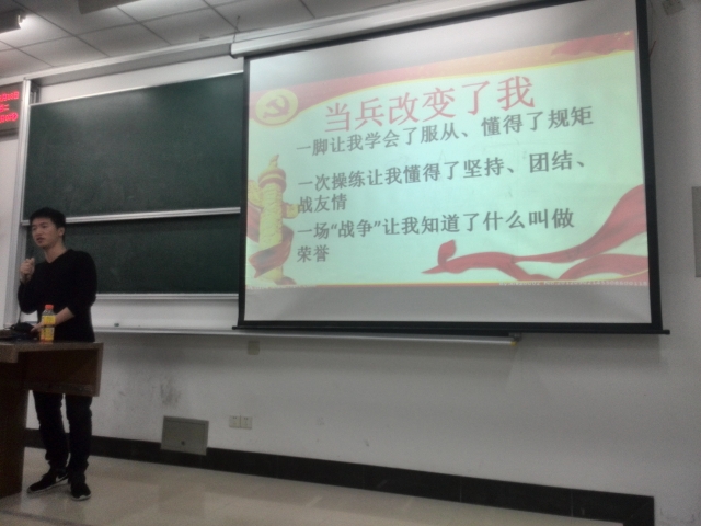 陈明东同学分享了自己在部队的点滴生活:新兵三个月的训练和自己成长的经历,平时训练的过程和团队意识的培养,执行重大安保任务的光荣经历。他在部队收获了深厚的战友情,同时各方面素质都得到了质的提高。