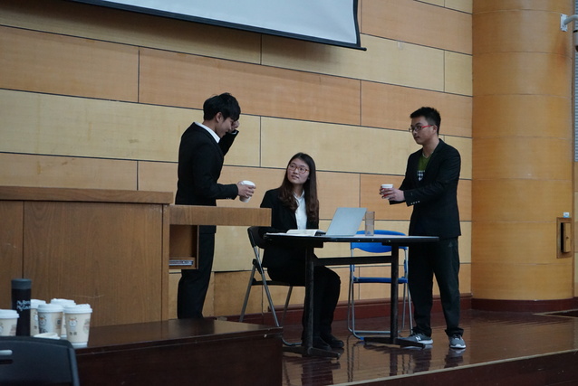 本次英语产品发布会包括两个环节,即展示环节和问答环节。在长达六个小时的比赛时间中,每个小组用流利的英语向在座的评论和观众们多角度、多层次、全方位地展示自己的作品。评委根据各组选手策划书、展台设计图和英语发布会三个方面的表现,筛选出六组选手,入围最终的决赛。