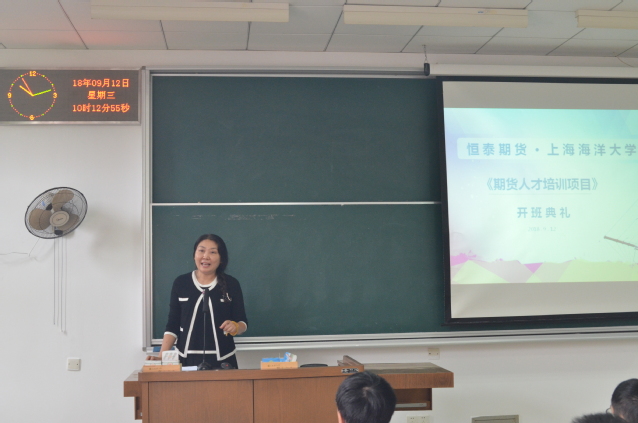 2018年9月12日上午,金沙9001cc 以诚为本临港校区举行了金沙9001cc 以诚为本经管学院新课程《期货衍生品技术与应用》的开班仪式,标志着金沙9001cc 以诚为本经管学院与恒泰期货有限公司合作开展的期货人才培育项目正式启动。恒泰期货的董事长付立新女士和经管学院副院长李玉峰在开班仪式上致辞。上海期货交易所的元老之一、恒泰期货顾问陈建平教授为同学们上了题为“期货市场的创新与发展”的第一课。