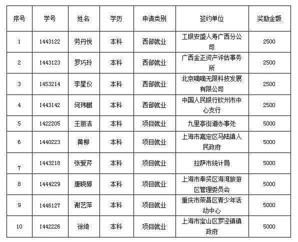 根据《金沙9001cc 以诚为本应届毕业生赴西部、艰苦行业就业奖励办法》(沪海洋学〔2017〕39号)文件精神,本着“公平、公正、公开”的原则,经个人申请、学院审核,现拟对我院符合赴西部、艰苦行业就业奖励申请条件的2018届应届毕业生名单公示如下: