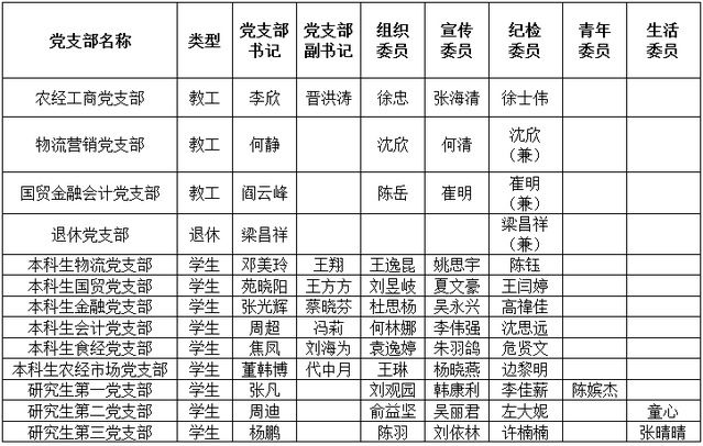根据《中国共产党章程》、《中国共产党党支部工作条例(试行)》、《中国共产党普通高等学校基层组织工作条例》、《普通高等学校学生党建工作标准》(教党[2017]8号)、《关于加强新形势下高校教职工党支部建设的意见》(沪教卫党〔2018〕314号)、《关于加强新形势下高校学生党支部建设的意见》(沪教卫党〔2018〕315号)、《关于进一步做好优化党支部设置和选优配强党支部书记队伍工作的通知》和《中国共产党基层组织选举工作暂行条例》,为进一步加强基层党支部的建设,经党支部选举、分工产生各党支部委员会。现将结果及工作分工通知如下: