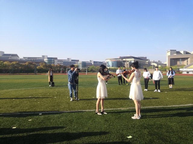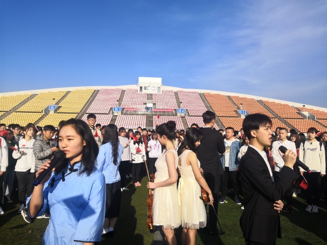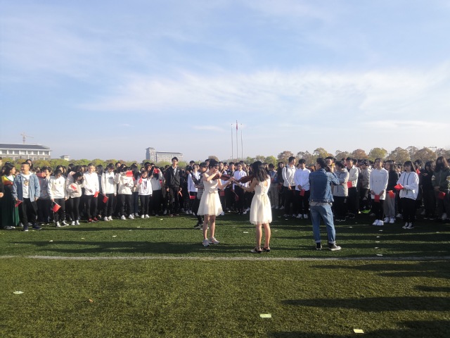 升旗仪式结束后,小提琴声响起,同学们纷纷聚集到操场中央。“我和我的祖国,一刻也不能分割,无论我走到哪里,都流出一首赞歌……”四位领唱人从人群中走出,用动人深情的歌声带领全场一起歌唱《我和我的祖国》。音乐又一遍响起,同学们则迅速变化成五角星队形,一同再唱起这支爱国赞歌。活动尾声,四位领唱人高举五星红旗站在五角星队形的中央,快闪活动在经久不息的掌声和欢呼声中结束。悠扬的小提琴曲,激昂的歌声,经管学子用这场青春快闪表达出对党和祖国的无限热爱。