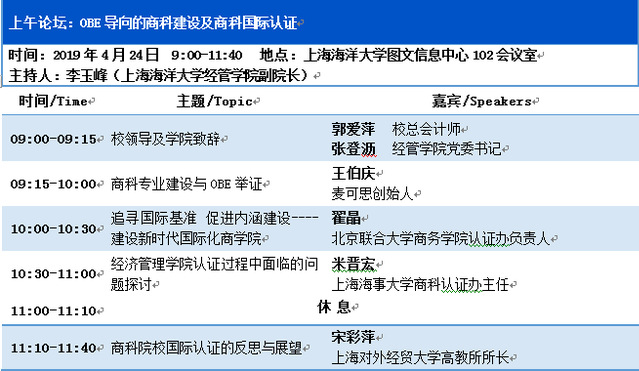 “新时代高教40条”中指出,要坚持学生中心,全面发展;坚持服务需求,成效导向;坚持完善机制,持续改进。基于OBE理念,参照国际商科认证标准进行商科建设和教学改革,已是多所高校的工作方向,如何通过数据对其过程持续监测,如何用数据对达成情况进行举证,是当前高校商科建设的重要内容。上海高校的商科院校建设及商科国际认证专题研讨会将于2019年4月24日上午在金沙9001cc 以诚为本经管学院举行,本次专题研讨会主题是“OBE导向的商科建设及商科国际认证”,诚邀您莅临指导交流,具体事宜安排如下: