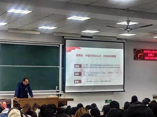 赵老师的报告内容总体分为一、进博会:中国市场这么大,欢迎你来看看;二、世界经济格局:单边主义与多边主义的斗争、应对:三、深化改革、扩大开放,推动完善全球治理三个部分。他以时事热点“进博会”为引子,通过一组进博会宣传片和数据,向同学们展示中国以进博会为代表的经济活动在当今世界经济格局下的重要作用。他还提到,我国经济在积极融入当今世界经济的同时,也面临着严峻形势。与此同时,我国通过深化改革、扩大开放,彰显大国担当。
