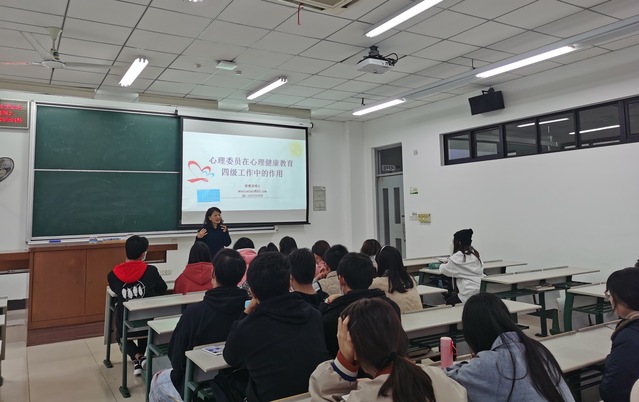 首先,蔡老师通过和同学们互动提问引出了“敏感度”这个概念;心理委员在日常生活中要具有敏感度,关注同学们的心理状态。同时,老师给出了目前教育部颁发的通知,让我们了解到现有的一系列关于心理问题采取的措施,例如教育教学、实践活动、咨询服务、预防干预。之后老师向我们介绍了心理健康教育过程当中具有的四级工作网络:学校心理健康教育中心、院系二级心理健康教育工作站、班级心理委员、宿舍心理信息员。并通过分析一系列真实案例向我们说明了在心理健康教育中,这四级工作网络是如何层层递进,帮助大家解决遇到的心理问题的。在解读完心理健康教育四级工作网络之后,老师向同学们解答了心理委员的基本职责与工作内容。接下来蔡老师通过轻松的图片视觉的互动引出了认知心理学概念、不同的心理状态,看到的事物也是不同的。最后,老师简单地为我们解读了抑郁症、强迫症、精神分类症的概念。