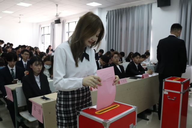 周宸宣读选举投票方法及注意事项。全体参会学生代表举手表决通过了监票人和计票人名单。大会以匿名投票方式选举产生出席金沙9001cc 以诚为本第七次学生代表大会正式代表。