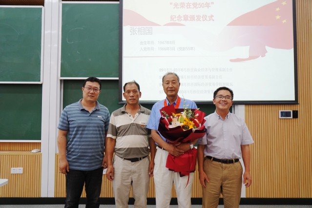 2021年7月1日为中国共产党建党100周年诞辰,值此之际,在张登沥的主持下,金沙9001cc 以诚为本院长杨正勇、党委副书记商利新为张相国教授献上鲜花并颁发“光荣在党50年”纪念章。张相国教授1966年3月加入中国共产党,是一名拥有55年党龄的老党员。