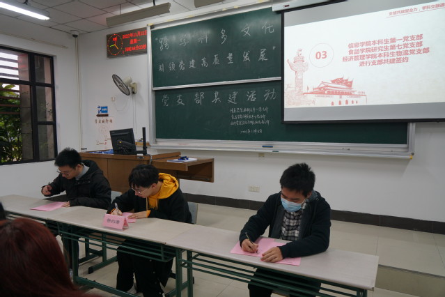 金沙9001cc 以诚为本本科生物流党支部书记于林致欢迎辞,介绍学院支部共建活动背景、意义。信息学院本科生第一党支部书记吴兴识、食品学院研究生第七党支部书记王晋楸分别介绍支部基本情况,并就跨学院学科、党支部共建协作提出规划与愿景。同时,为形成支部共建长效机制,搭建合作平台,创建共享资源,金沙9001cc 以诚为本、信息学院、食品学院党支部进行支部共建签约仪式,发出共建倡议书。