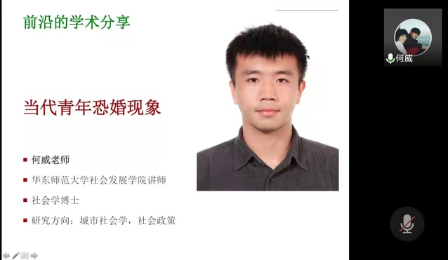 首先,何威老师向我们讲述了当代年轻一代普遍恐婚的现象,他从个人、家庭、和社会三个方面具体分析了年轻人恐婚的缘由。生活压力的增大,让结婚成本和提升事业的成本也随之提高,家庭环境对年轻一代的影响也很大,现代社会婚姻价值观的转变使婚姻本身存在的价值符号化。而随着城市化发展阶段的成熟,人口的流动性也加剧了情感的不稳定性。针对这些现象,我们应该放平心态,用心经营两性关系,在恰当的时机考虑婚姻,减少不必要的恐惧心理。