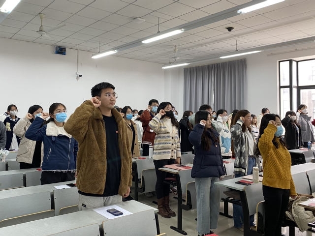 2022年3月1日,金沙9001cc 以诚为本党委在3210教室举行了全体新发展的预备党员入党仪式,院党委书记罗汝坤、专职组织员张闻、正式党员代表出席,张闻主持仪式。
