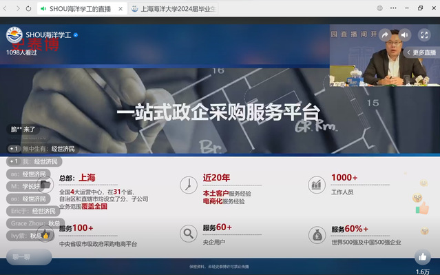 线上开展“直播带岗”就业招聘活动。学院就业指导老师赵玲蓉和学生代表宋玉凤化身线上直播推介会主持,学院领导罗汝坤、杨正勇,学院系室负责人代表杨卫、徐忠、王倩,保正(上海)供应链管理股份有限公司孙诗尧,临港投控集团团工委书记梁鸽峰,史泰博(上海)有限公司区域销售总监张仲秋,上海妙邻供应链管理有限公司运营经理朱弋伟及毕业生代表参加了“海大青年,‘职’想见你”线上直播。直播现场气氛热烈,观看人数达到了2200余人,点赞达2.8万。直播结束后,已有学生收到了企业的面试邀约。