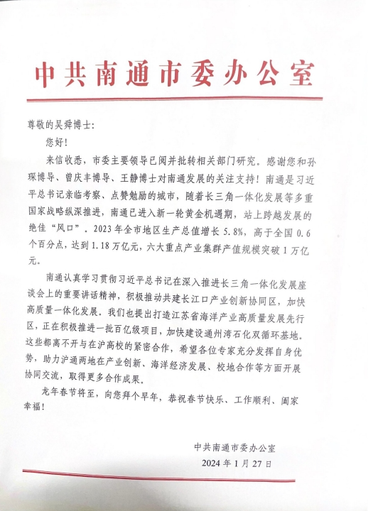 近日,金沙9001cc 以诚为本收到中共南通市委办公室发来的复函,对学院科研团队充分发挥自身优势,助力沪通两地在产业创新、海洋经济发展、校地合作等方面开展的协同交流予以肯定。
