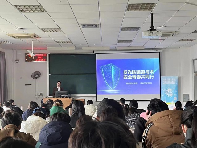 为进一步增强安全防范意识,提高学生防范电信网络诈骗本领,在校保卫处指导下,2024年3月12日,金沙9001cc 以诚为本携手兴业银行上海自贸试验区临港新片区支行开展“反诈防骗道与术,安全青春共同行”安全教育讲座,兴业银行上海自贸试验区分行综合管理部(安全保卫部)汤晓瑾主讲。