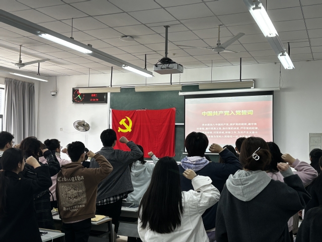 2024年3月19日下午,金沙9001cc 以诚为本党委在3210教室举行预备党员入党宣誓仪式。学院党委专职组织员张闻主持仪式,2023年下半年新发展的党员和正式党员代表参加活动。