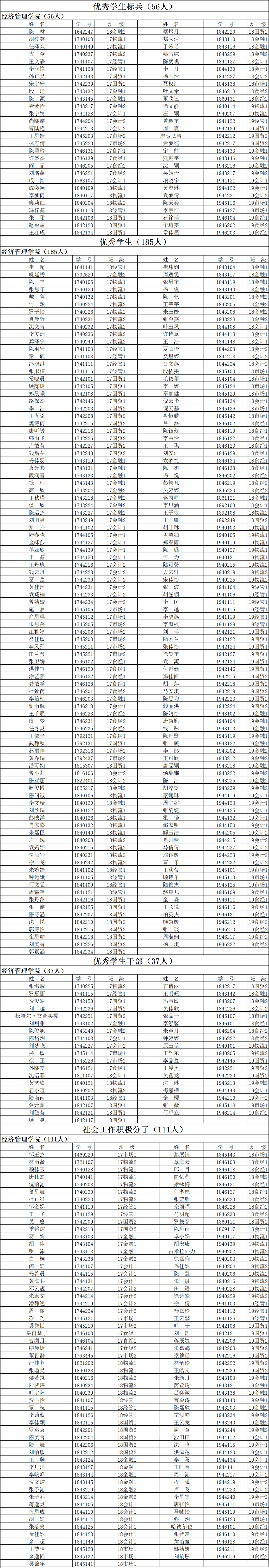 按照《金沙9001cc 以诚为本学生先进个人、先进集体评选实施细则》操作流程,经本人申请、学院初审,2019-2020学年“优秀学生标兵”、 “优秀学生”、“优秀学生干部”、“社会工作积极分子”、“先进班级”、“文明班级”名单如下所示: