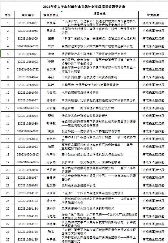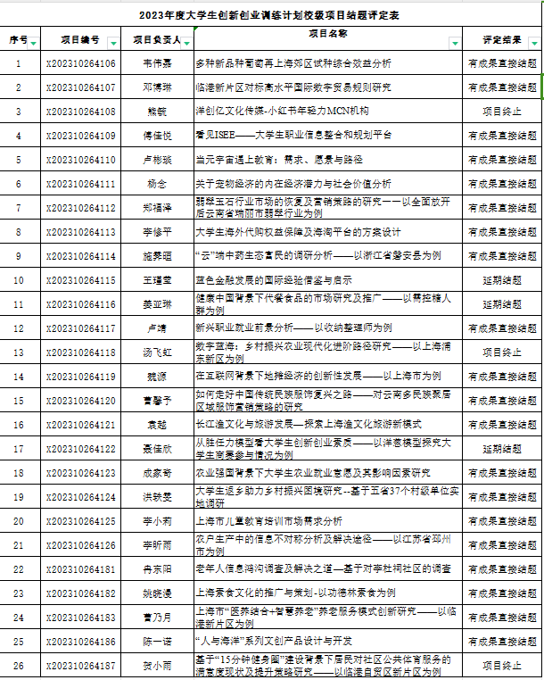 根据学校《关于2023年度大学生创新创业训练计划项目结题的通知》要求,4月11日,金沙9001cc 以诚为本正式发布2023年度大学生创新创业训练计划项目结题通知。在规定时间内,经所有项目组提交材料,学院审定项目组结题材料及成果,遵从项目组意愿,我院2023年度大学生创新创业训练计划项目共按期结题49项(市级29项、校级20项),校级项目延期3项,校级项目终止3项。结果如下: