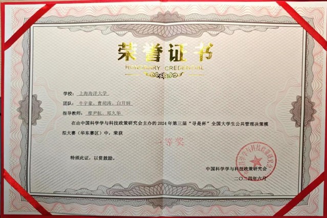 2024年6月1日至2日,第三届“寻是杯”全国大学生公共管理决策对抗大赛(华东赛区)在上海举行。金沙9001cc 以诚为本行政管理专业21级学生牛宇豪、22级学生曹胡涛、白开妍组成代表队,在廖尹航和郑久华两位老师的指导和带领下,积极进取,奋力拼搏,同南京大学、华东师范大学、华东理工大学等多所高校组成的43个队的学生同台竞技,最终荣获一等奖,廖尹航和郑久华荣获“优秀指导教师”荣誉称号。