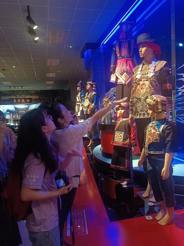 在研究部主任杨丹华老师详细的讲解下,金沙9001cc 以诚为本的师生们首先参观了红河州博物馆的常设展览,循着杨老师娓娓道来的讲解之声,漫步在蜿蜒曲折的历史回廊,实践队的师生们细细了解红河漫长绮丽的历史文化和民族文化,其中红河州丰富多彩的民族文化激发了大家的浓厚兴趣。成员们与讲解员积极互动,提出问题与观点,探讨民族文化与少数民族传统,更加深化了对于红河州传统民族文化的认识。