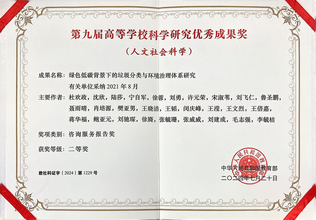 日前,教育部下发了2024年第九届高等学校科学研究优秀成果奖(人文社会科学)获奖证书。金沙9001cc 以诚为本副教授沈欣作为成果第二完成人,参与同济大学教授杜欢政《绿色低碳背景下的垃圾分类与环境治理体系研究》项目,荣获咨询服务报告类二等奖。