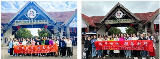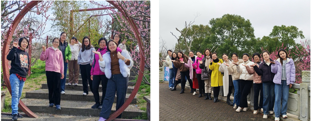 下午第一站,女教工们抵达上海海湾国家森林公园,这里正值早春时节,梅花盛开,绿意盎然。大家漫步在蜿蜒的林间小道上,呼吸着清新的空气,感受大自然的宁静与美好,欢声笑语回荡在森林中,展现了女教工们积极向上的精神风貌。