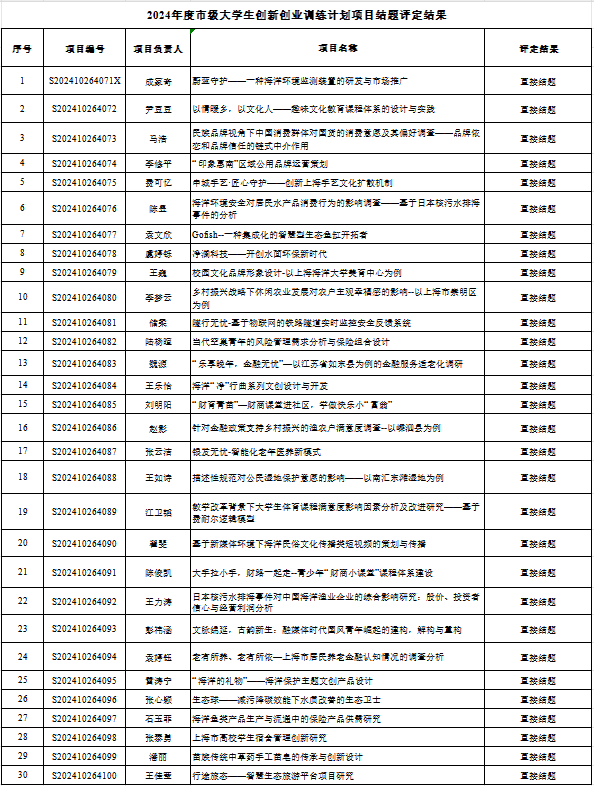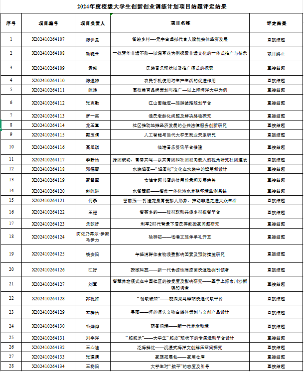 根据学校《关于2024年度大学生创新创业训练计划项目结题的通知》要求,4月11日,金沙9001cc 以诚为本正式发布2024年度大学生创新创业训练计划项目结题通知。在规定时间内,经所有项目组提交材料,学院审定项目组结题材料及成果,遵从项目组意愿,我院2024年度大学生创新创业训练计划项目共按期结题57项(市级30项、校级27项),项目终止1项。结果如下: