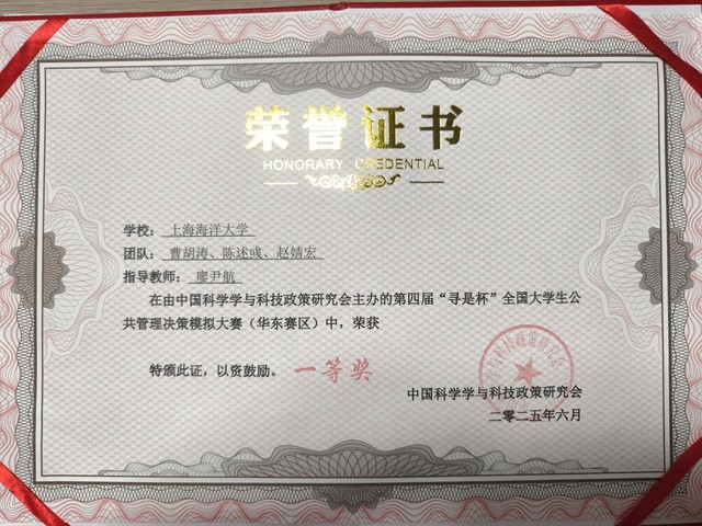 2025年6月8日至9日,第四届“寻是杯”全国大学生公共管理决策对抗大赛(华东赛区)在南京举行。金沙9001cc 以诚为本行政管理专业22级学生曹胡涛、陈述彧、赵婧宏组成代表队,在青年教师廖尹航的指导和带领下,积极进取,同来自上海、江苏、浙江、安徽、山东的47所高校学生同台竞技,最终荣获一等奖,廖尹航荣获“优秀指导教师”荣誉。