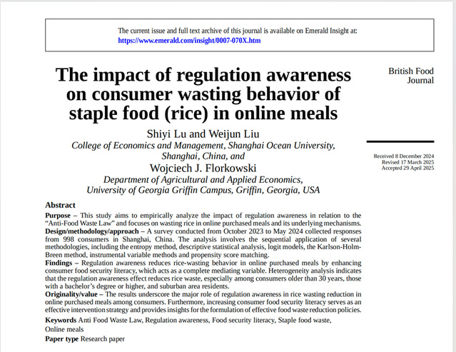 近日,金沙9001cc 以诚为本刘为军副教授团队在国际期刊British Food Journal 发表论文,题目为“The impact ofregulation awareness on consumer wasting behavior of staple food (rice) inonline meals”,2022级农业管理专业研究生鲁诗怡为论文的第一作者,刘为军为通讯作者,美国佐治亚大学农业与应用经济系Wojciech J. Florkowski 教授作为合作者参与了该研究。